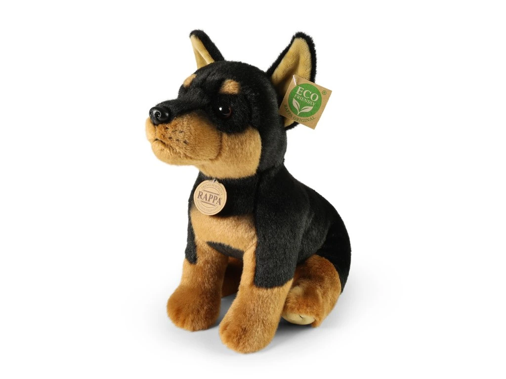 Plyšový pes rasy dobrman měří 30 cm a díky těm nejkvalitnějším materiálům se řadí do Exkluzivní kolekce plyšových hraček značky Rappa. Díky ručnímu zpracování každého kusu navíc vypadá jako živý. Proč označení ECO-FRIENDLY? Rappa si je vědoma všech dopadů na životního prostředí, zaměřuje se na udržitelnost a omezení používání plastů na minimum. Proto je výplň hraček vyrobena z recyklovaných materiálů, zejména PET lahví. Ta je však zcela nezávadná a vhodná i pro děti od narození. FUN FACT: Věděli jste, že dobrmani jsou jedni z nejchytřejších psů na světě a v testech inteligence bývají pravidelně mezi prvními pěti plemeny?Doplňkové parametry