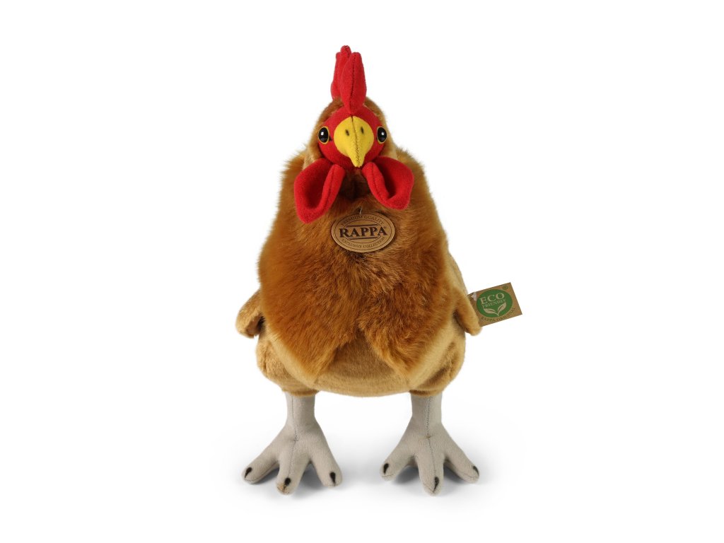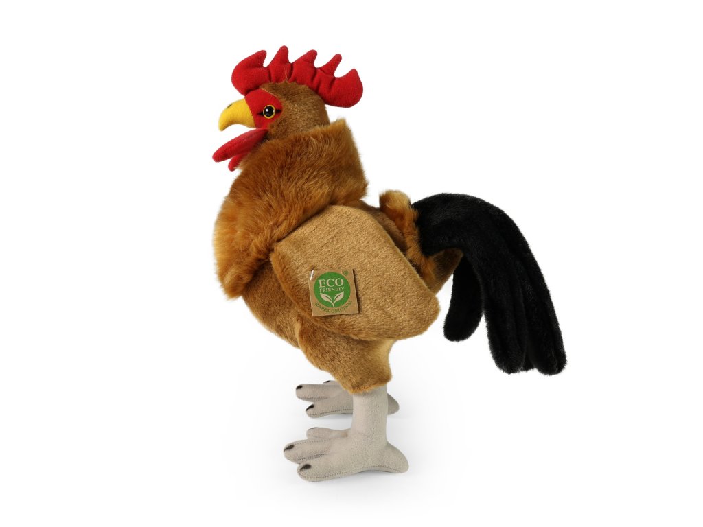 Hrdý postoj, zářivě červený hřebínek, laloky, které mu dodávají vzhled důležitého generála a ocasní pera, která hrají všemi barvami duhy, to je ve zkratce tento plyšový kohout. Se svou velikostí už to není žádné kuřátko, ale pořádný kus drůbeže, který se stane nepřehlédnutelnou dominantou ve vašem bytě. Je to v podstatě opeřený budík, kterému někdo navždy vyndal baterky. Vypadá, jako by právě vyhrál první cenu na okresní zemědělské výstavě a přišel vám to hrdě oznámit, ale místo hlasitého kokrhání vám nabídne jen tichou, pestrobarevnou eleganci a hřebínek, který stojí vždy perfektně v pozoru.